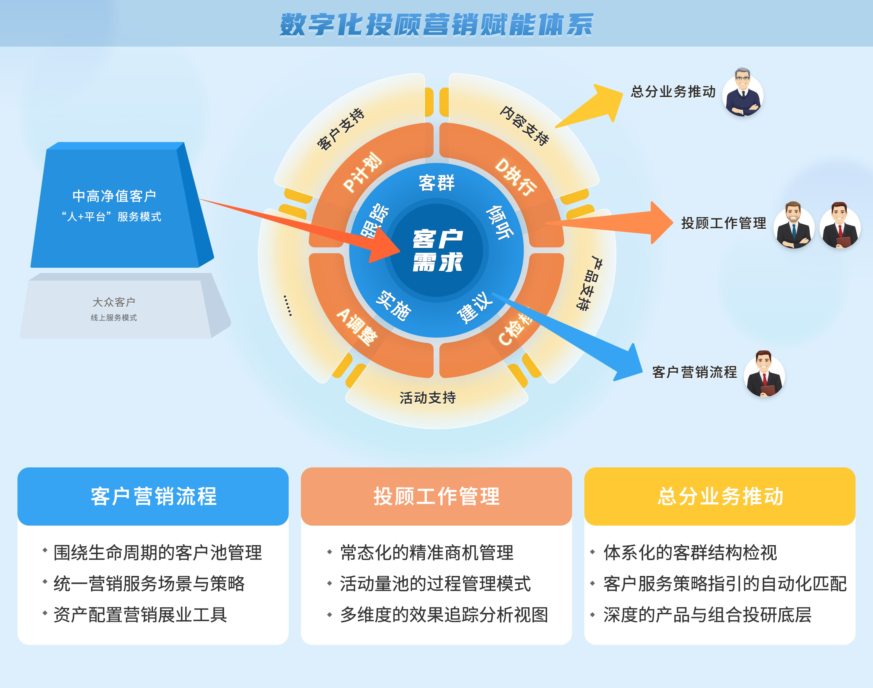 數(shù)字化投顧營銷賦能體系的實際落地,依托兩大核心能力,一是以資產(chǎn)配置服務(wù)為中心的買方投顧業(yè)務(wù)能力,二是關(guān)注客戶AUM結(jié)構(gòu)的客群經(jīng)營能力。旨在解決券商現(xiàn)有投顧展業(yè)平臺存在的問題,包括總分中臺與一線團隊業(yè)績達成思路不一致、一線管盤客戶服務(wù)覆蓋不足、日常服務(wù)無法滿足客戶個性化需求、以及投顧工作過程管理不透明等現(xiàn)狀。