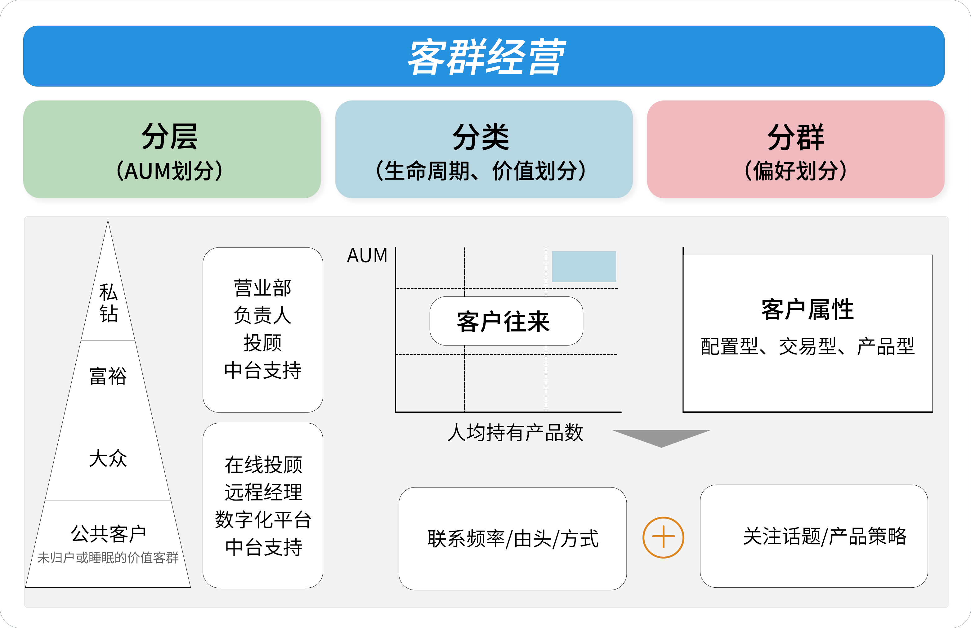 總分中臺從整體業(yè)績達成思路變革,搭建前中臺聯(lián)動、高效的營銷賦能體系,聚焦投顧服務(wù)視角,關(guān)注客戶AUM結(jié)構(gòu)和資產(chǎn)配置需求。通過規(guī)范客戶經(jīng)營流程,提煉標準化的營銷場景、策略以及展業(yè)工具賦能投顧,日常透過投顧的營銷過程追蹤管理,不局限于電訪、面談活動量,同時總分業(yè)務(wù)推動上為客群室和產(chǎn)品室提供基礎(chǔ)建設(shè)支持,包括客群結(jié)構(gòu)檢視看板、策略指引的自動化匹配工具以及深度的產(chǎn)品與組合投研底層支持。